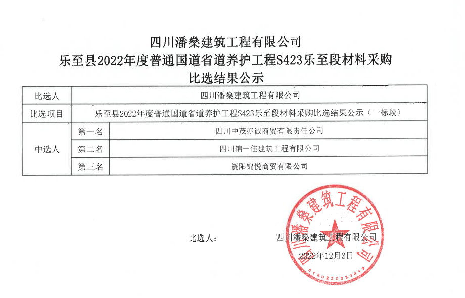 乐至县2022年度普通国道省道养护工程S423乐至段施工材料采购(一标段)比选结果公示